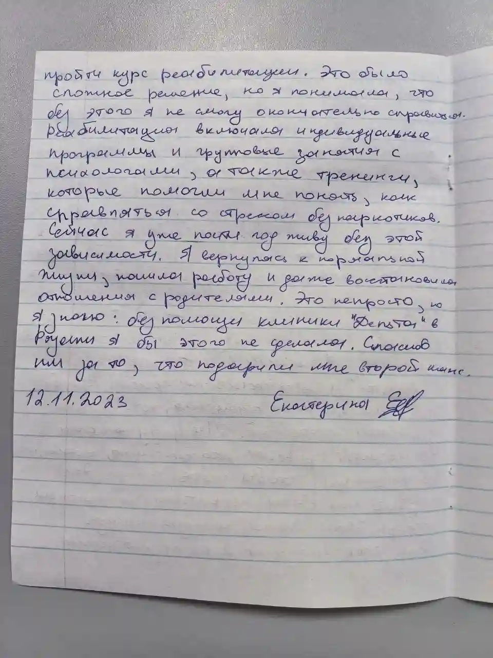 Однажды, после особенно тяжёлой ночи, я поняла, что либо умру, либо попытаюсь что-то изменить. Я нашла в интернете клинику "Дельта" и записалась на приём. Врачи приняли меня без осуждения, хотя я была в ужасном состоянии. Мне сразу начали помогать: провели детоксикацию, поставили капельницы, чтобы снять ломку. Эти первые дни были непростыми, но персонал поддерживал меня каждую минуту. После детоксикации мне предложили пройти курс реабилитации. Это было сложное решение, но я понимала, что без этого я не смогу окончательно справиться.